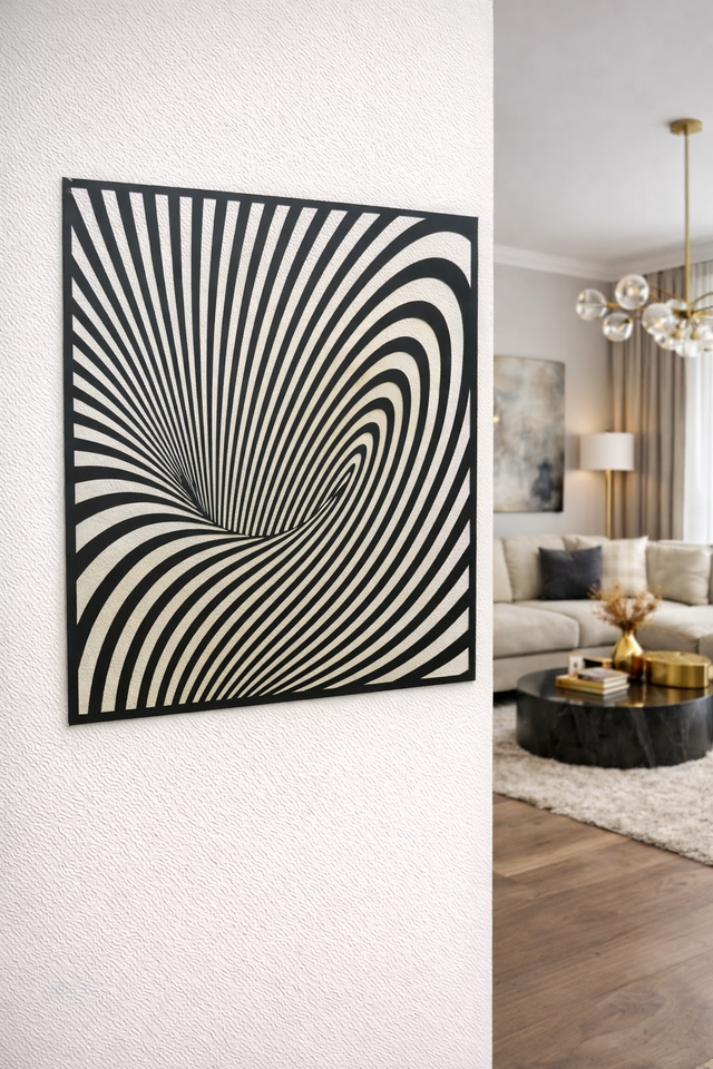 Cette décoration murale au design géométrique crée un puissant effet optique de mouvement et de profondeur. Les lignes courbes et dynamiques attirent immédiatement le regard et apportent une touche contemporaine et artistique à votre intérieur. Selon l’angle de vue et la lumière, le motif semble évoluer, offrant une expérience visuelle originale et moderne.