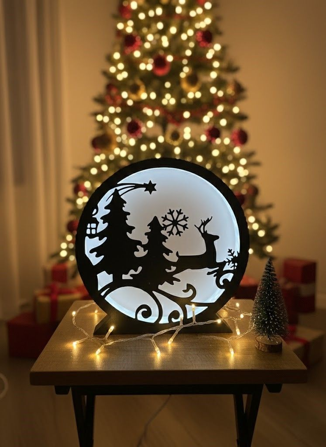 Lampe décorative de Noël imprimée en 3D. La lumière diffuse par l’arrière met en valeur la silhouette et crée une ambiance chaleureuse près du sapin, sur un meuble ou une table basse.