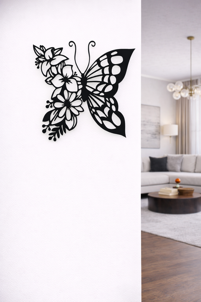 Cette décoration murale représente un papillon délicatement associé à un motif floral, symbole de transformation, de liberté et de renouveau. Le contraste entre les ailes finement ajourées et les fleurs apporte une grande élégance visuelle, tout en conservant une sensation de légèreté et d’harmonie.