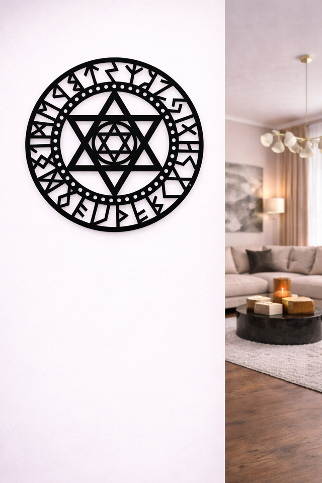 Cette décoration murale circulaire met en valeur un symbole géométrique inspiré des traditions nordiques, associant runes anciennes et formes sacrées. Le motif central, puissant et équilibré, évoque la protection, la sagesse et l’énergie spirituelle, tandis que l’anneau de runes renforce son caractère mystique et intemporel.